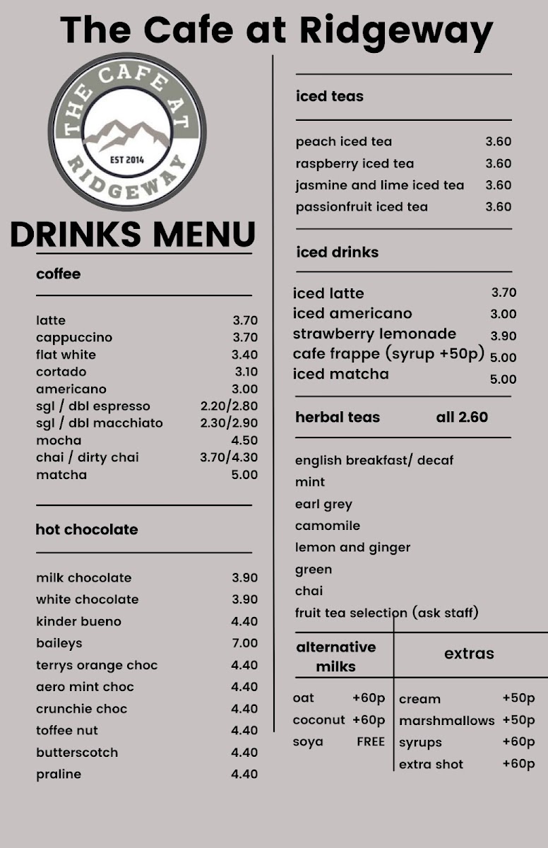 The Cafe At Ridgeway on Allt-Yr-Yn Avenue in Newport offers an inviting menu that captivates coffee lovers and snack enthusiasts alike. Their expertly crafted coffee selection features classics like Latte, Cappuccino, and Flat White, alongside richer choices such as Mocha and Matcha, catering to varied palates. For warmer days, the iced beverages—like Iced Latte, Iced Americano, and refreshing Strawberry Lemonade—bring welcomed relief. The menu also includes savory snacks like Hot Dogs and Nachos, perfect for pairing with a cup or enjoying on the go.